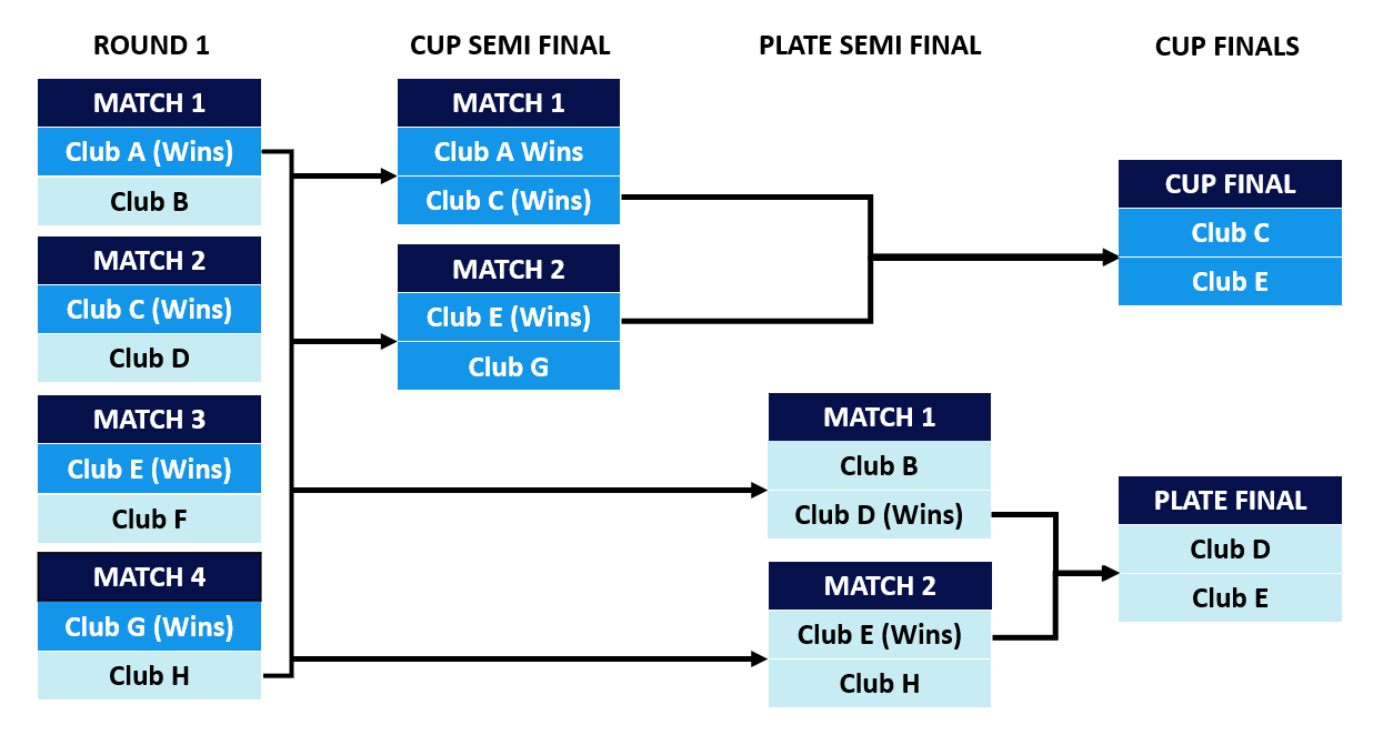 The losing 4 teams progress to the Semi Final of the Plate Competition and the winners progress to the Final of the Plate Competition.